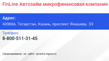 FinLine-Автозайм, микрофинансовая компания по адресу 420066, Татарстан, Казань, проспект Ямашева, 33 в дальнейшем Организация, размещена в следующих категориях: