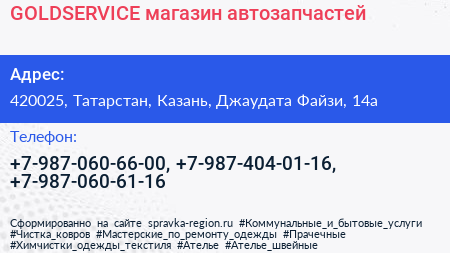 GOLDSERVICE, магазин автозапчастей по адресу 420025, Татарстан, Казань, Джаудата Файзи, 14а в дальнейшем Организация, размещена в следующих категориях: