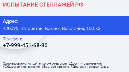 ИСПЫТАНИЕ-СТЕЛЛАЖЕЙ.РФ по адресу 420095, Татарстан, Казань, Восстания, 100 к3 в дальнейшем Организация, размещена в следующих категориях: