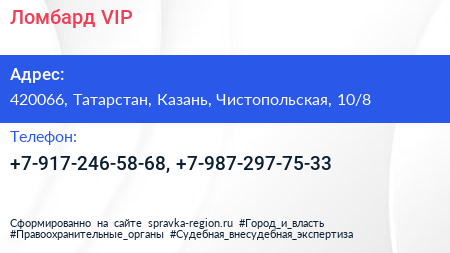 Ломбард VIP по адресу 420066, Татарстан, Казань, Чистопольская, 10/8 в дальнейшем Организация, размещена в следующих категориях: