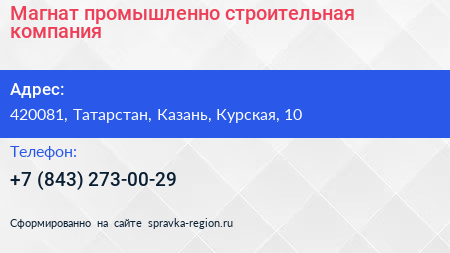 Магнат, промышленно-строительная компания по адресу 420081, Татарстан, Казань, Курская, 10 в дальнейшем Организация, размещена в следующих категориях:
