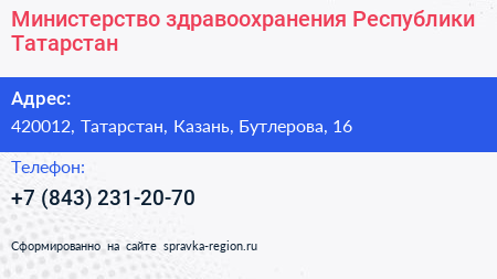 Министерство здравоохранения Республики Татарстан по адресу 420012, Татарстан, Казань, Бутлерова, 16 в дальнейшем Организация, размещена в следующих категориях: