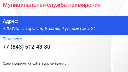 Муниципальная служба примирения по адресу 420095, Татарстан, Казань, Кулахметова, 21 в дальнейшем Организация, размещена в следующих категориях:
