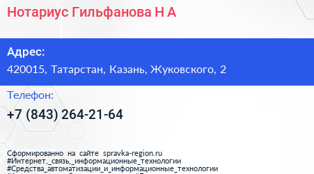 Нотариус Гильфанова Н.А. по адресу 420015, Татарстан, Казань, Жуковского, 2 в дальнейшем Организация, размещена в следующих категориях: