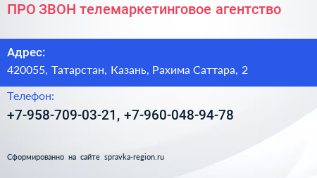 ПРО-ЗВОН, телемаркетинговое агентство по адресу 420055, Татарстан, Казань, Рахима Саттара, 2 в дальнейшем Организация, размещена в следующих категориях: