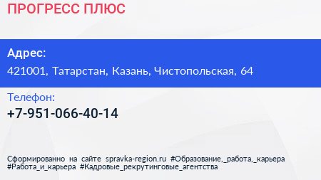 ПРОГРЕСС ПЛЮС по адресу 421001, Татарстан, Казань, Чистопольская, 64 в дальнейшем Организация, размещена в следующих категориях: