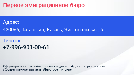 Первое эмиграционное бюро по адресу 420066, Татарстан, Казань, Чистопольская, 5 в дальнейшем Организация, размещена в следующих категориях: