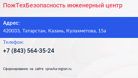 ПожТехБезопасность, инженерный центр по адресу 420033, Татарстан, Казань, Кулахметова, 15а в дальнейшем Организация, размещена в следующих категориях: