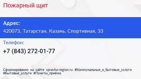 Пожарный щит по адресу 420073, Татарстан, Казань, Спортивная, 33 в дальнейшем Организация, размещена в следующих категориях: