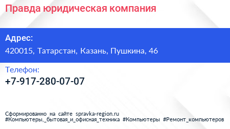 Правда, юридическая компания по адресу 420015, Татарстан, Казань, Пушкина, 46 в дальнейшем Организация, размещена в следующих категориях: