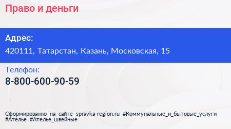 Право и деньги по адресу 420111, Татарстан, Казань, Московская, 15 в дальнейшем Организация, размещена в следующих категориях: