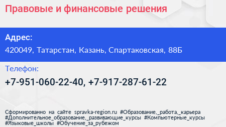 Правовые и финансовые решения по адресу 420049, Татарстан, Казань, Спартаковская, 88Б в дальнейшем Организация, размещена в следующих категориях: