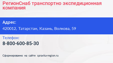 РегионСнаб, транспортно-экспедиционная компания по адресу 420012, Татарстан, Казань, Волкова, 59 в дальнейшем Организация, размещена в следующих категориях: