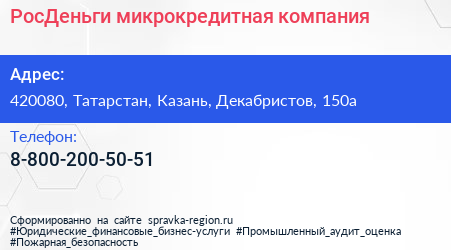 РосДеньги, микрокредитная компания по адресу 420080, Татарстан, Казань, Декабристов, 150а в дальнейшем Организация, размещена в следующих категориях: