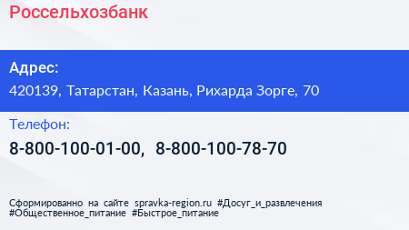 Россельхозбанк по адресу 420139, Татарстан, Казань, Рихарда Зорге, 70 в дальнейшем Организация, размещена в следующих категориях: