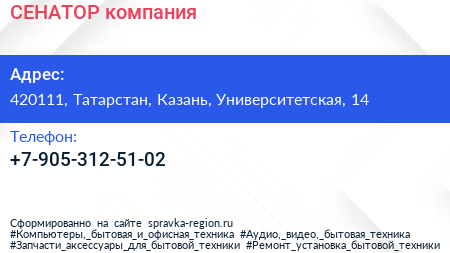 СЕНАТОР, компания по адресу 420111, Татарстан, Казань, Университетская, 14 в дальнейшем Организация, размещена в следующих категориях: