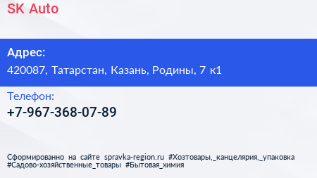 SK-Auto по адресу 420087, Татарстан, Казань, Родины, 7 к1 в дальнейшем Организация, размещена в следующих категориях: