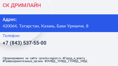 СК ДРИМЛАЙН по адресу 420064, Татарстан, Казань, Баки Урманче, 8 в дальнейшем Организация, размещена в следующих категориях: