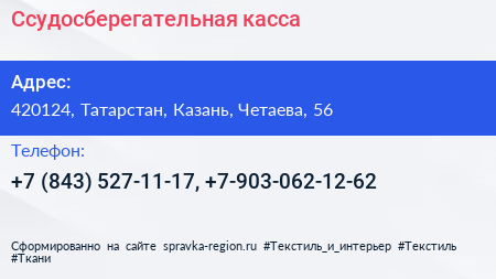 Ссудосберегательная касса по адресу 420124, Татарстан, Казань, Четаева, 56 в дальнейшем Организация, размещена в следующих категориях: