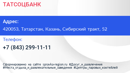 ТАТСОЦБАНК по адресу 420053, Татарстан, Казань, Сибирский тракт, 52 в дальнейшем Организация, размещена в следующих категориях: