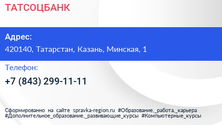 ТАТСОЦБАНК по адресу 420140, Татарстан, Казань, Минская, 1 в дальнейшем Организация, размещена в следующих категориях: