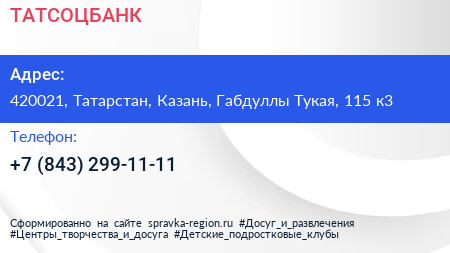 ТАТСОЦБАНК по адресу 420021, Татарстан, Казань, Габдуллы Тукая, 115 к3 в дальнейшем Организация, размещена в следующих категориях: