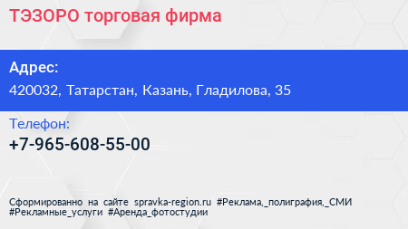 ТЭЗОРО, торговая фирма по адресу 420032, Татарстан, Казань, Гладилова, 35 в дальнейшем Организация, размещена в следующих категориях: