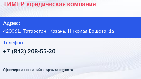 ТИМЕР, юридическая компания по адресу 420061, Татарстан, Казань, Николая Ершова, 1а в дальнейшем Организация, размещена в следующих категориях: