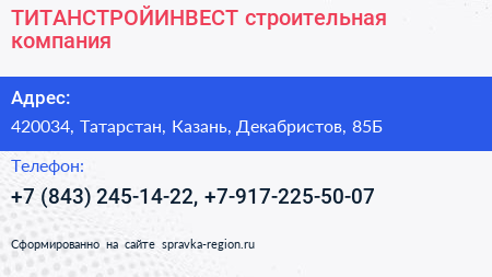 ТИТАНСТРОЙИНВЕСТ, строительная компания по адресу 420034, Татарстан, Казань, Декабристов, 85Б в дальнейшем Организация, размещена в следующих категориях: