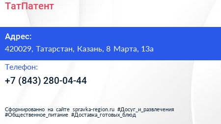 ТатПатент по адресу 420029, Татарстан, Казань, 8 Марта, 13а в дальнейшем Организация, размещена в следующих категориях: