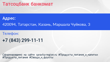 Татсоцбанк, банкомат по адресу 420094, Татарстан, Казань, Маршала Чуйкова, 3 в дальнейшем Организация, размещена в следующих категориях:
