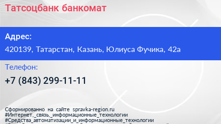 Татсоцбанк, банкомат по адресу 420139, Татарстан, Казань, Юлиуса Фучика, 42а в дальнейшем Организация, размещена в следующих категориях: