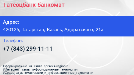 Татсоцбанк, банкомат по адресу 420126, Татарстан, Казань, Адоратского, 21а в дальнейшем Организация, размещена в следующих категориях: