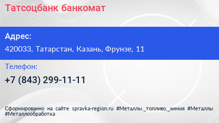 Татсоцбанк, банкомат по адресу 420033, Татарстан, Казань, Фрунзе, 11 в дальнейшем Организация, размещена в следующих категориях: