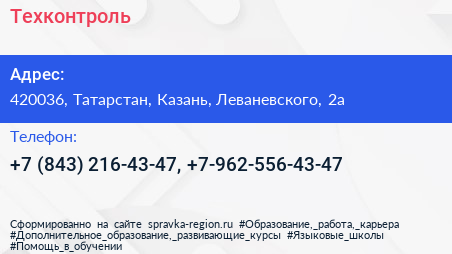 Техконтроль+ по адресу 420036, Татарстан, Казань, Леваневского, 2а в дальнейшем Организация, размещена в следующих категориях: