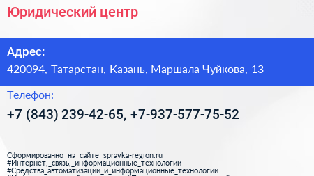 Юридический центр по адресу 420094, Татарстан, Казань, Маршала Чуйкова, 13 в дальнейшем Организация, размещена в следующих категориях: