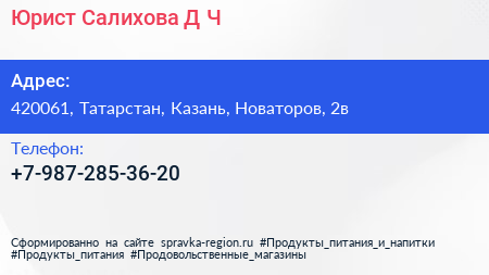 Юрист Салихова Д.Ч. по адресу 420061, Татарстан, Казань, Новаторов, 2в в дальнейшем Организация, размещена в следующих категориях: