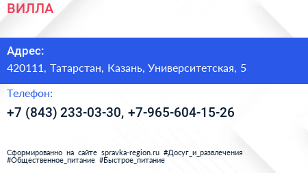 ВИЛЛА по адресу 420111, Татарстан, Казань, Университетская, 5 в дальнейшем Организация, размещена в следующих категориях: