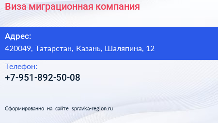 Виза, миграционная компания по адресу 420049, Татарстан, Казань, Шаляпина, 12 в дальнейшем Организация, размещена в следующих категориях: