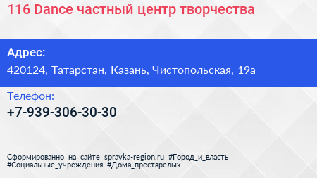 116. Dance, частный центр творчества по адресу 420124, Татарстан, Казань, Чистопольская, 19а в дальнейшем Организация, размещена в следующих категориях: