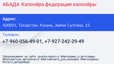 АБАДА Капоэйра, федерация капоэйры по адресу 420021, Татарстан, Казань, Зайни Султана, 15 в дальнейшем Организация, размещена в следующих категориях: