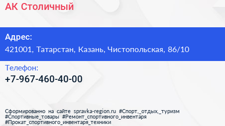 АК Столичный по адресу 421001, Татарстан, Казань, Чистопольская, 86/10 в дальнейшем Организация, размещена в следующих категориях: