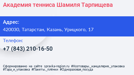 Академия тенниса Шамиля Тарпищева по адресу 420030, Татарстан, Казань, Урицкого, 17 в дальнейшем Организация, размещена в следующих категориях: