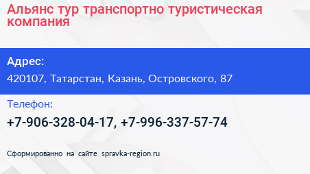 Альянс-тур, транспортно-туристическая компания по адресу 420107, Татарстан, Казань, Островского, 87 в дальнейшем Организация, размещена в следующих категориях: