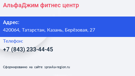 АльфаДжим, фитнес-центр по адресу 420064, Татарстан, Казань, Берёзовая, 27 в дальнейшем Организация, размещена в следующих категориях: