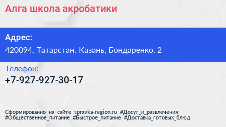 Алга, школа акробатики по адресу 420094, Татарстан, Казань, Бондаренко, 2 в дальнейшем Организация, размещена в следующих категориях:
