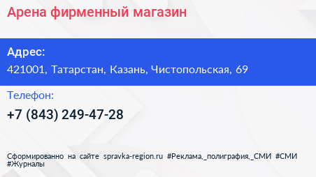 Арена, фирменный магазин по адресу 421001, Татарстан, Казань, Чистопольская, 69 в дальнейшем Организация, размещена в следующих категориях: