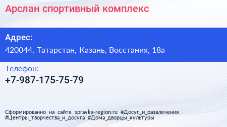 Арслан, спортивный комплекс по адресу 420044, Татарстан, Казань, Восстания, 18а в дальнейшем Организация, размещена в следующих категориях: