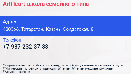 ArtHeart, школа семейного типа по адресу 420066, Татарстан, Казань, Солдатская, 8 в дальнейшем Организация, размещена в следующих категориях: