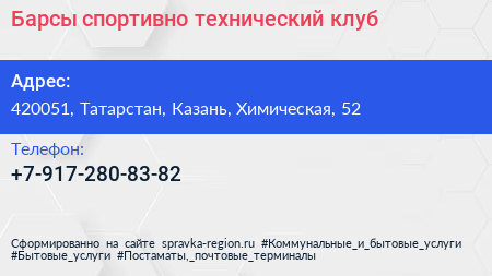 Барсы, спортивно-технический клуб по адресу 420051, Татарстан, Казань, Химическая, 52 в дальнейшем Организация, размещена в следующих категориях: